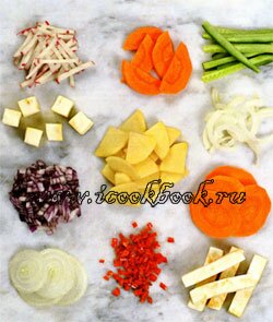 Что нужно: 1 морковка, 1 картофелина, 1 луковица, 100 г корня сельдерея, 1 острый перчик, 1 огурец. Что делать: 2. Репчатый лук для салатов обычно режут полукольцами, а для украшения - кольцами. Для мелкой нарезки существует очень удобный способ. Половину луковицы нарезают вдоль, не доходя до донышка 1 см, затем режут поперек. Оставшееся цельным донышко не дает луку развалиться. 3. Многие хозяйки любят нарезку брусочками - профессионалы называют ее «батонет». Самый подходящий размер брусочков 12x12x40 мм. Для картофеля-фри длину можно увеличить до 50-60 мм. 4. Из брусочков можно сделать идеальные по форме кубики. Эту нарезку используют для супов, зажарок и салатов из отварных овощей. 6. Название спичечной нарезки, или аллюметт, говорит само за себя. Овощи должны быть похожи на спички. Идеальна для овощных салатов из моркови, редьки, редиса, огурцов. Нарезка совсем тонкой соломкой, или «жюльен», придает блюдам красивый аккуратный вид. Толщина соломки должна быть 2-4 мм, а длина от 3 до 12 см.